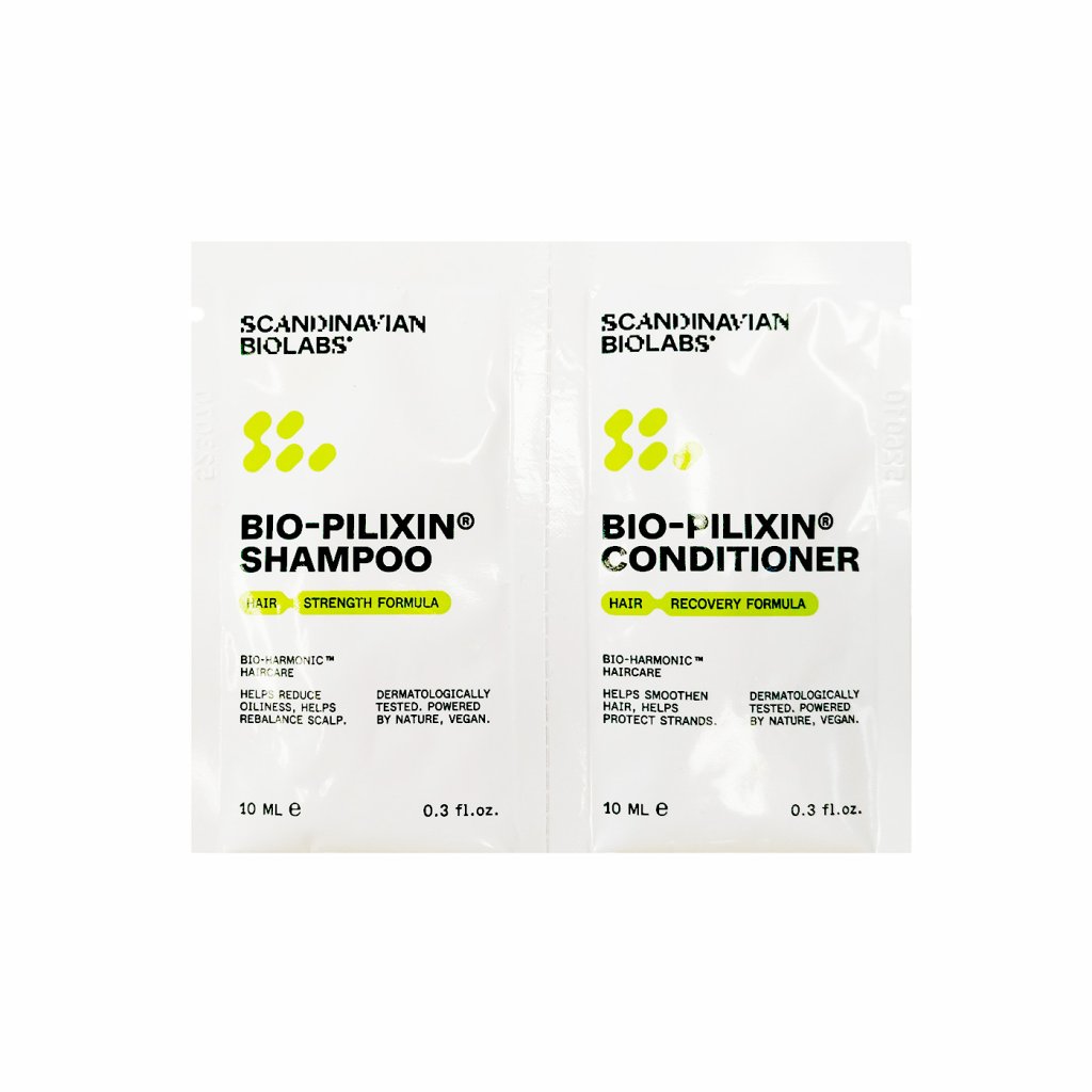 Vzorka šampónu a kondicionéru BIO-Pilixin pre podporu rastu vlasov. Objem: 2 × 10 ml.
