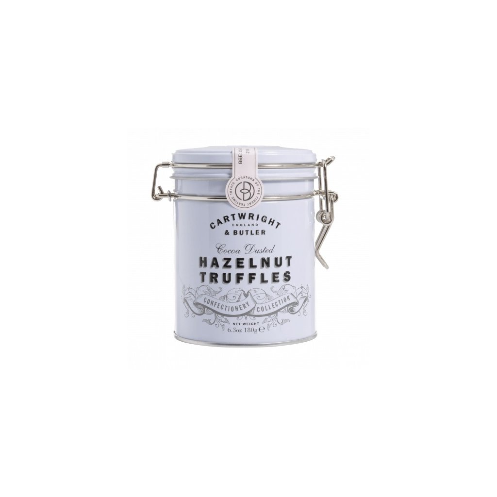 Čokoládové pralinky s lieskovoorieškovým krémom, obalené v kakau. V plechovej dóze.