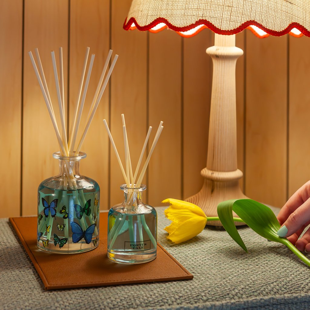 Vonný difuzér s ôsmimi ratanovými tyčinkami. Vôňa "Butterfly" je svieža citrusová vôňa grepov, mandarínok, citrónov, pomarančov, zemolezu, magnólie a koriandru. Vykúzlite čarovnú atmosféru plnú pestrofarebných motýľov a farieb vďaka ktorej sa budete deň čo deň ešte radšej tešiť domov. Tento difuzér funguje na princípe vzlínaniu, stačí len ratanové tyčinky vložiť do vonné esencie, intenzitu si potom upravíte podľa množstva tyčiniek v esenciu. Pre zaistenie rovnomerného uvoľňovanie vône otočte tyčinky vnútri esencia každej 2-3 dni. Vyrobené v Portugalsku Objem: 100ml, Balené v darčekovej krabičke.