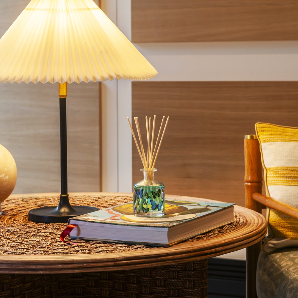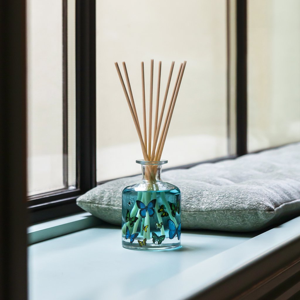 Difuzér s ôsmimi ratanovými tyčinkami. Tento difuzér funguje na princípe vzlínaniu, stačí len ratanové tyčinky vložiť do vonné esencie, intenzitu si potom upravíte podľa množstva tyčiniek v esenciu. Vôňa "Butterfly" je svieža citrusová vôňa grepov, mandarínok, citrónov, pomarančov, zemolezu, magnólie a koriandru. Farebné tyrkysové balenie s motívom motýlikov pripomína letné morský vánok. Objem 250ml.