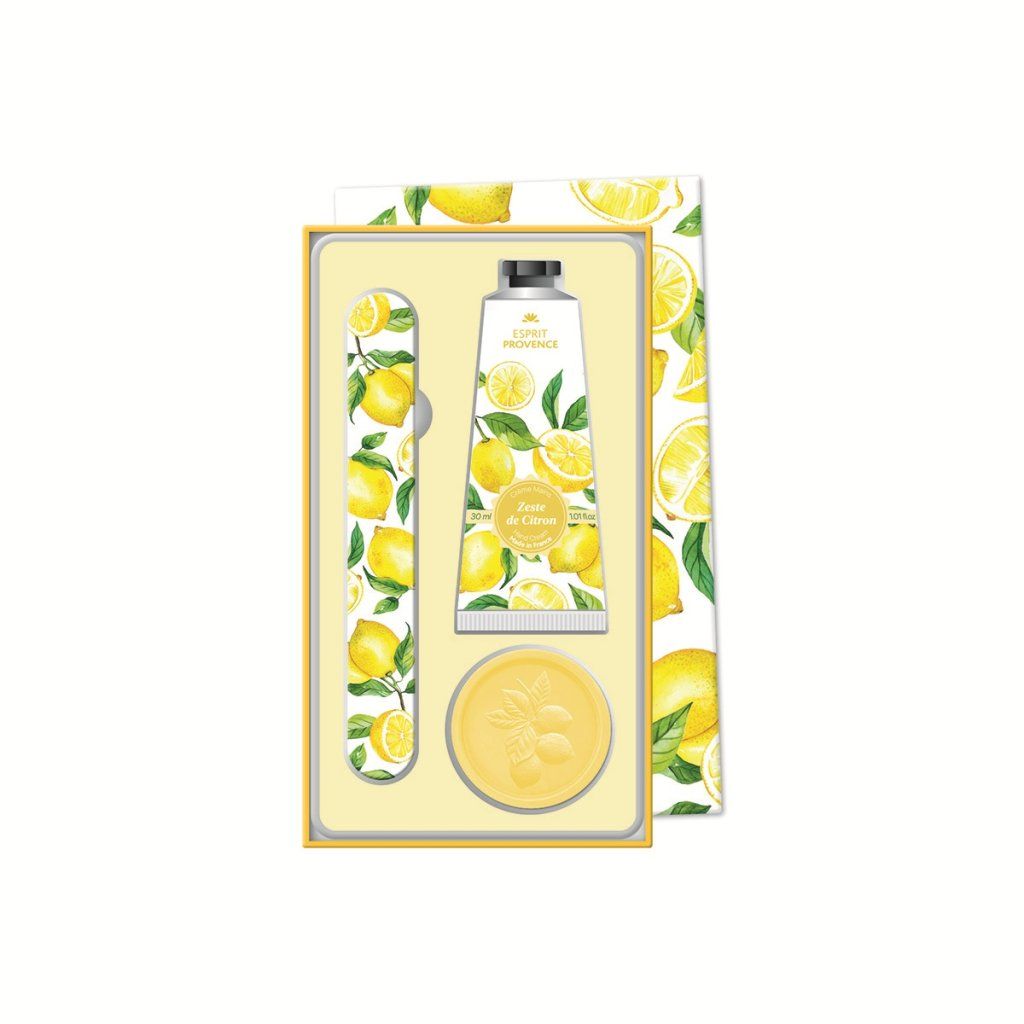 Elegantná darčeková sada starostlivosti o ruky od značky Esprit Provence s osviežujúcou vôňou citrónovej kôry predstavuje ideálny tip na darček aj praktického spoločníka na každodennú starostlivosť o ruky. Sada obsahuje všetko potrebné pre čisté, hydratované a upravené ruky – krém na ruky, tuhé mydlo a pilník na nechty v kompaktnom prevedení vhodnom aj na cesty.