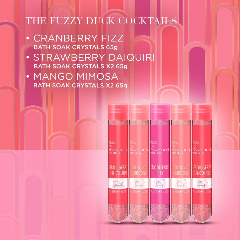 Vyberte si jednu z troch vôní kúpeľových kryštálikov a ponorte sa do teplého vodného kúpeľa. Zažite skutočný relaxačný zážitok a zahaľte pokožku tela nádhernou vôňou inšpirovanou koktailmi, ktorá dodá kúpeľu to správne čaro. Ktorá "kokteilová" vôňa vás osloví dnes - Strawberry Daiquiri, Mango Mimosa alebo Cranberry Fizz?