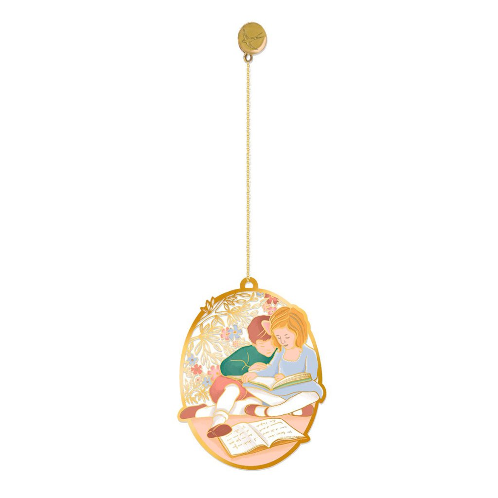 Autorská ilustrácia Emílie Gauvrit zachytáva nežný moment zdieľaného čítania a prináša do každej knihy kvapku nostalgie. Vďaka zlatému retiazke s ozdobným príveskom záložka elegantne vytŕča z knihy a pôsobí ako malý šperk medzi stranami.