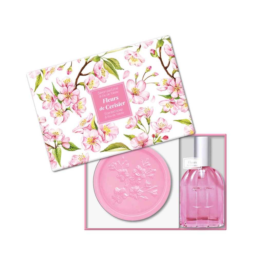 Dárková sada přírodního tuhého mýdla a toaletní vody s vůní třešňového květu.