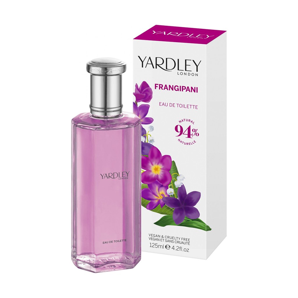 - Fľaštička: Fľaštička Yardley Frangipani má elegantný hranatý tvar so strieborným uzáverom a jemne ružovým odtieňom vône, ktorý pôsobí sviežo a žensky.