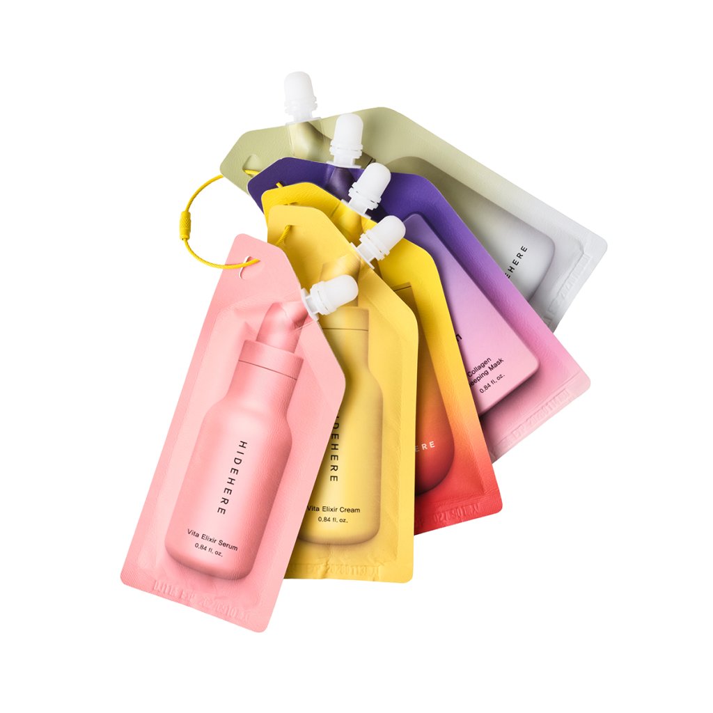 Tato sada pěti pleťových produktů od korejské značky HIDEHERE je navržena tak, aby dodala pleti vitamíny, hydrataci a jas. Obsahuje čisticí gel se zeleným čajem a kolagenem, který šetrně odstraňuje nečistoty a připravuje pleť na další péči. Vitamínové sérum a krém Vita Elixir sjednocují tón pleti, zlepšují její pružnost a rozjasňují mdlý vzhled. Krém s vysokým SPF50+ chrání pleť před slunečním zářením a podporuje tvorbu kolagenu, zatímco noční maska s kolagenem poskytuje intenzivní regeneraci a hydrataci během spánku. Produkty se rychle vstřebávají, nezanechávají lepivý pocit a jsou baleny v inovativních výpustných sáčcích, které uchovávají přírodní a šetrné ingredience. Všech pět produktů je spojeno praktickým kroužkem, díky kterému je můžete snadno zavěsit v koupelně a mít celou rutinu vždy po ruce.