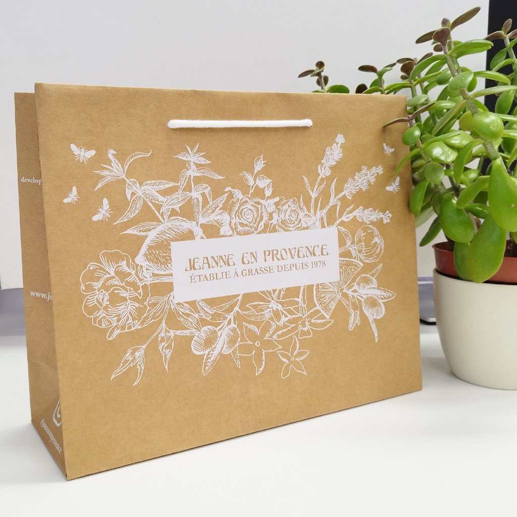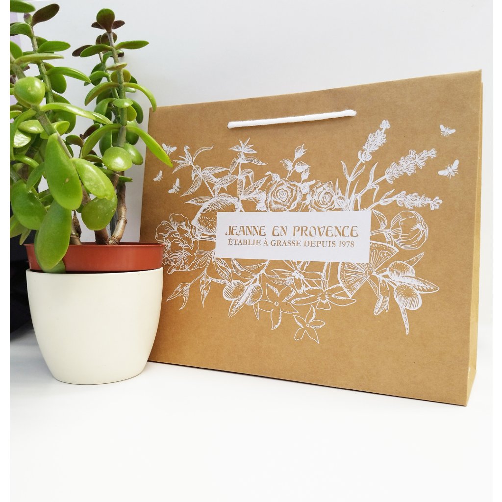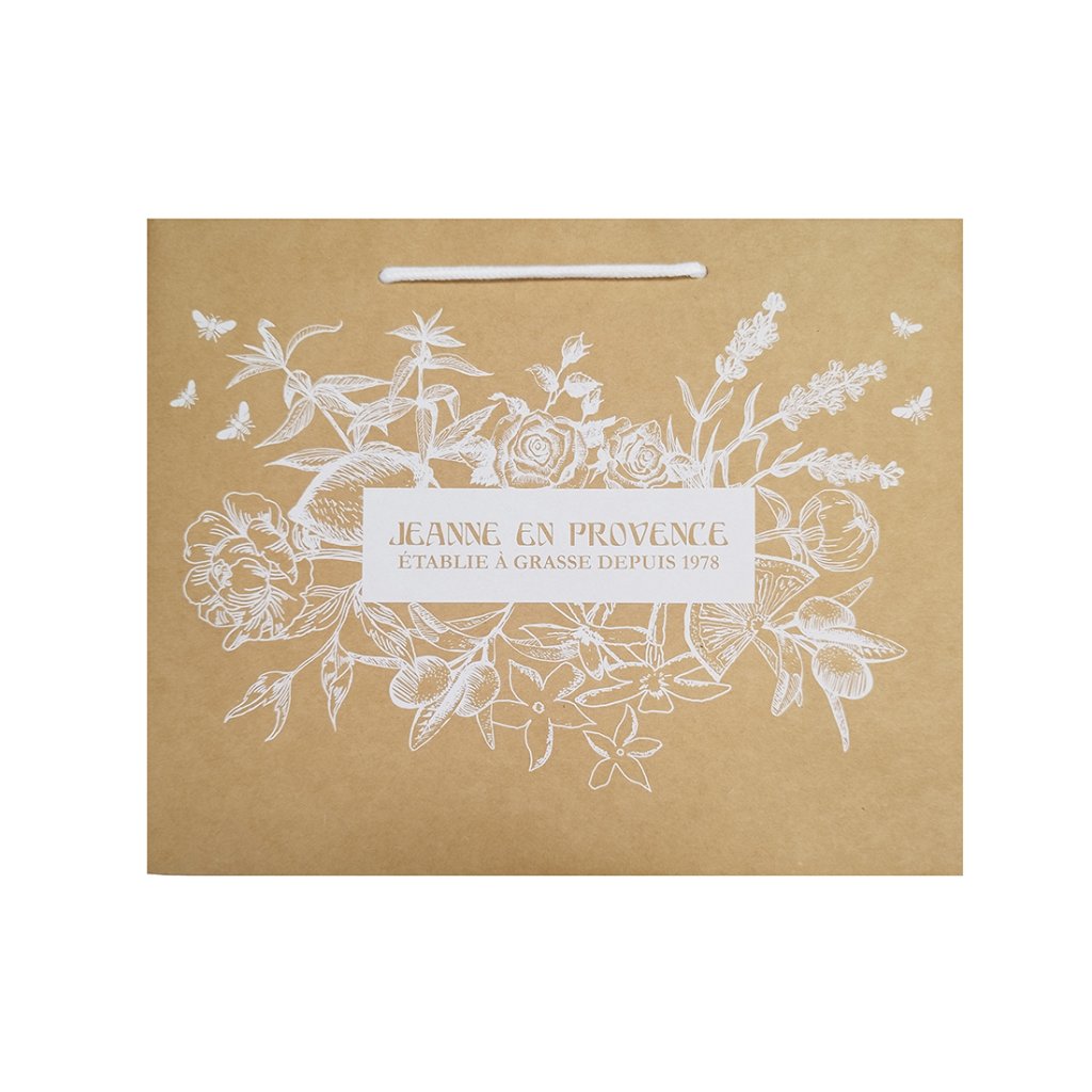 Darčeková taška šedej farby s logom Jeanne en Provence. Rozmery: 33x24x10cm