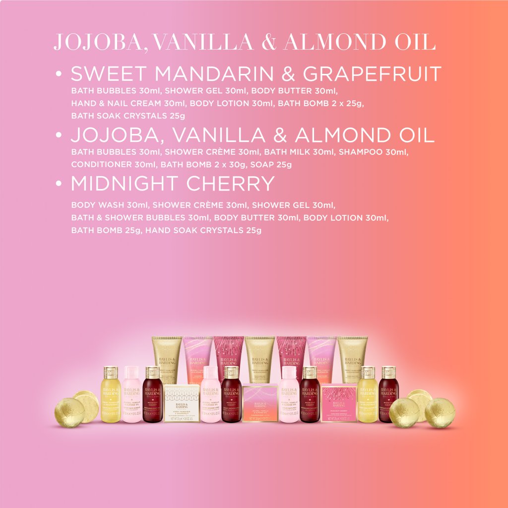 Skráťte si čakanie na Vianoce a vychutnajte si 24 luxusných ošetrujúcich mini produktov s vôňou jojoby, sladkej vanilky a mandľového oleja. Nájdete medzi nimi okrem iného aj náš obľúbený sprchový gél a krém, telové mlieko alebo penu do kúpeľa. Nechýbajú ani produkty pre starostlivosť o ruky a nohy a kryštály do kúpeľa s nádhernou vôňou.