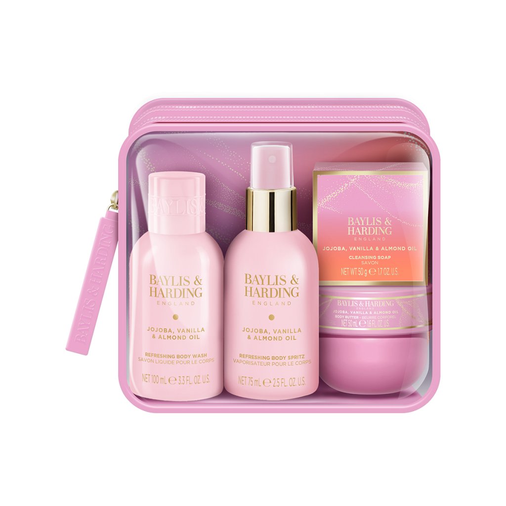 Jojoba, Vanilla & Almond Oil - súprava starostlivosti o telo, 4 ks cestovná sada telových produktov a hmly na telo v toaletnej taštičke