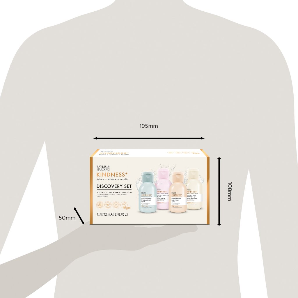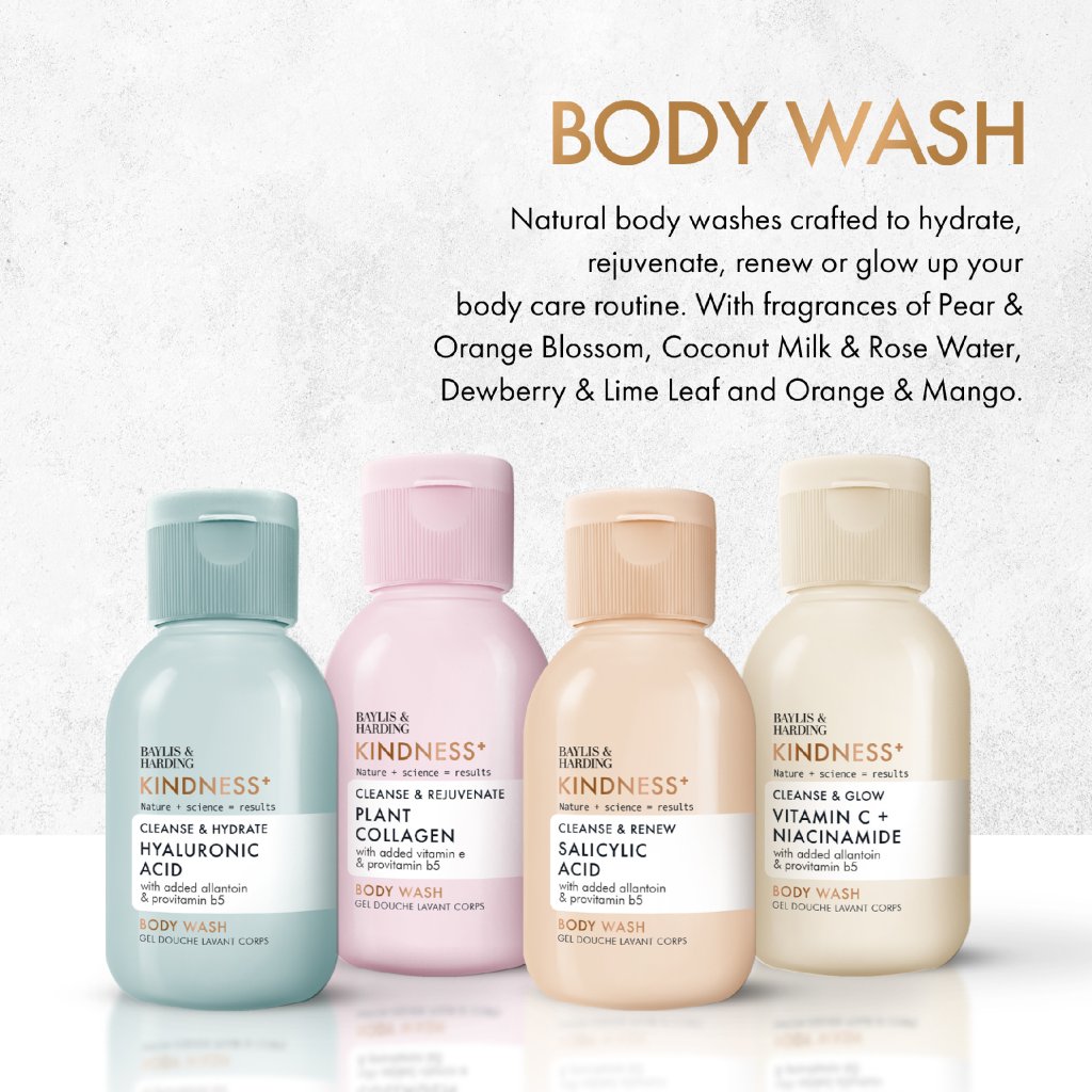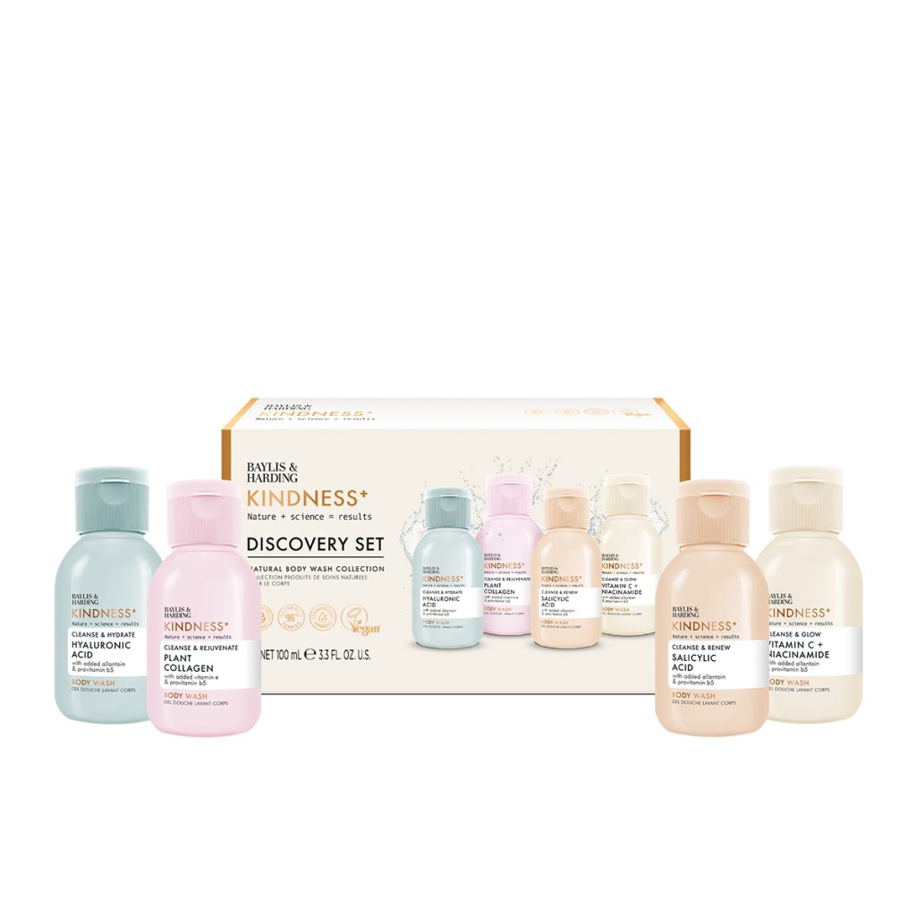 Starajte sa o svoju pokožku každý deň inak – so starostlivo zostavenou sadou sprchových gélov Baylis & Harding, ktorá spája vedu, prírodu a výsledky. Štyri mini sprchové gély s vysoko účinnými zložkami, ako je kyselina hyalurónová, vitamín C, niacínamid, kyselina salicylová a rastlinný kolagén, ponúkajú cielenú starostlivosť pre hydratáciu, zjemnenie, rozjasnenie a obnovu pokožky.