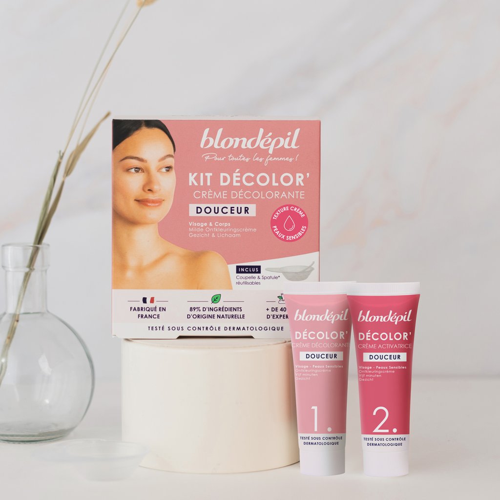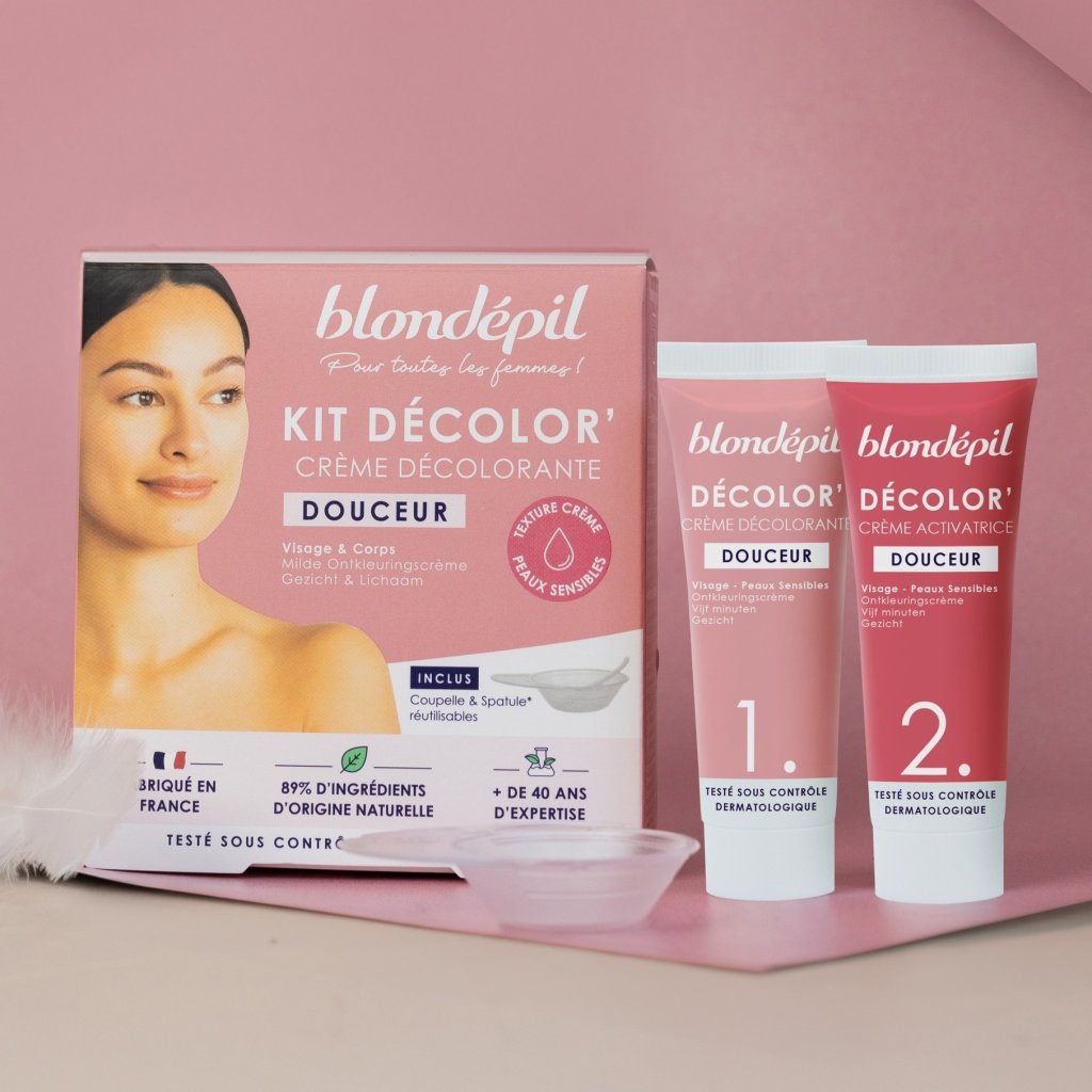 Rozlúčte sa s tmavými chĺpkami na tvári! Blondépil Kit Décolor’ bol špeciálne vyvinutý pre citlivú pokožku a jemne zosvetľuje chĺpky na tvári tak, aby dokonale splývali s tónom vašej pleti. Krémová textúra je šetrná k pokožke a prináša prirodzený svetlý efekt až na 4 týždne.