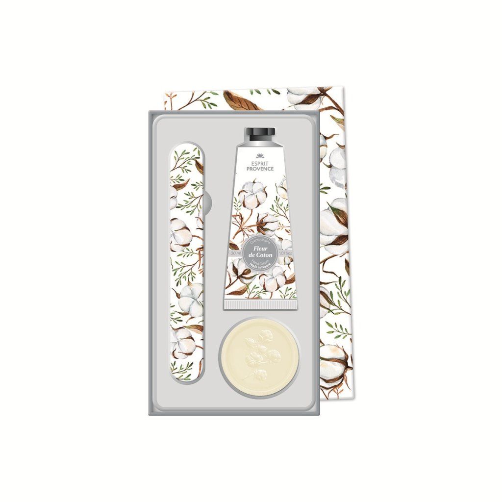 Elegantná darčeková sada starostlivosti o ruky od značky Esprit Provence s jemnou vôňou bavlníkových kvetov predstavuje ideálny tip na darček aj praktického spoločníka pre každodennú starostlivosť o ruky. Sada obsahuje všetko potrebné pre čisté, hydratované a upravené ruky – krém na ruky, tuhé mydlo a pilník na nechty v kompaktnom prevedení vhodnom aj na cesty.