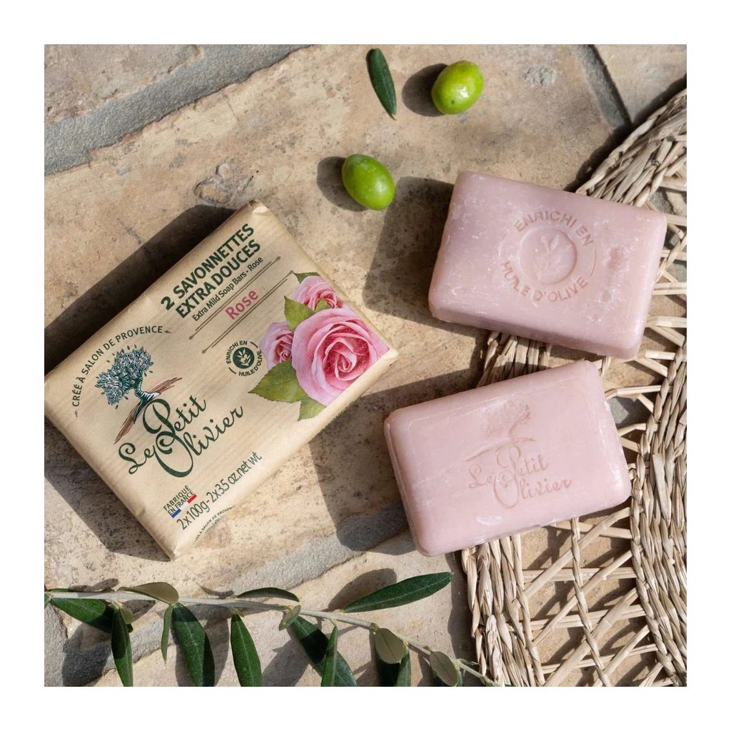 Extra jemné mydlo francúzskej značky Le Petit Olivier s kvetinovou vôňou ruží. Prírodné mydlo s olivovým olejom a prírodnými extraktmi. Bez parabénov a fenoxyetanol. Jemne čistí a hydratuje pokožku. Balenie 2x100g.