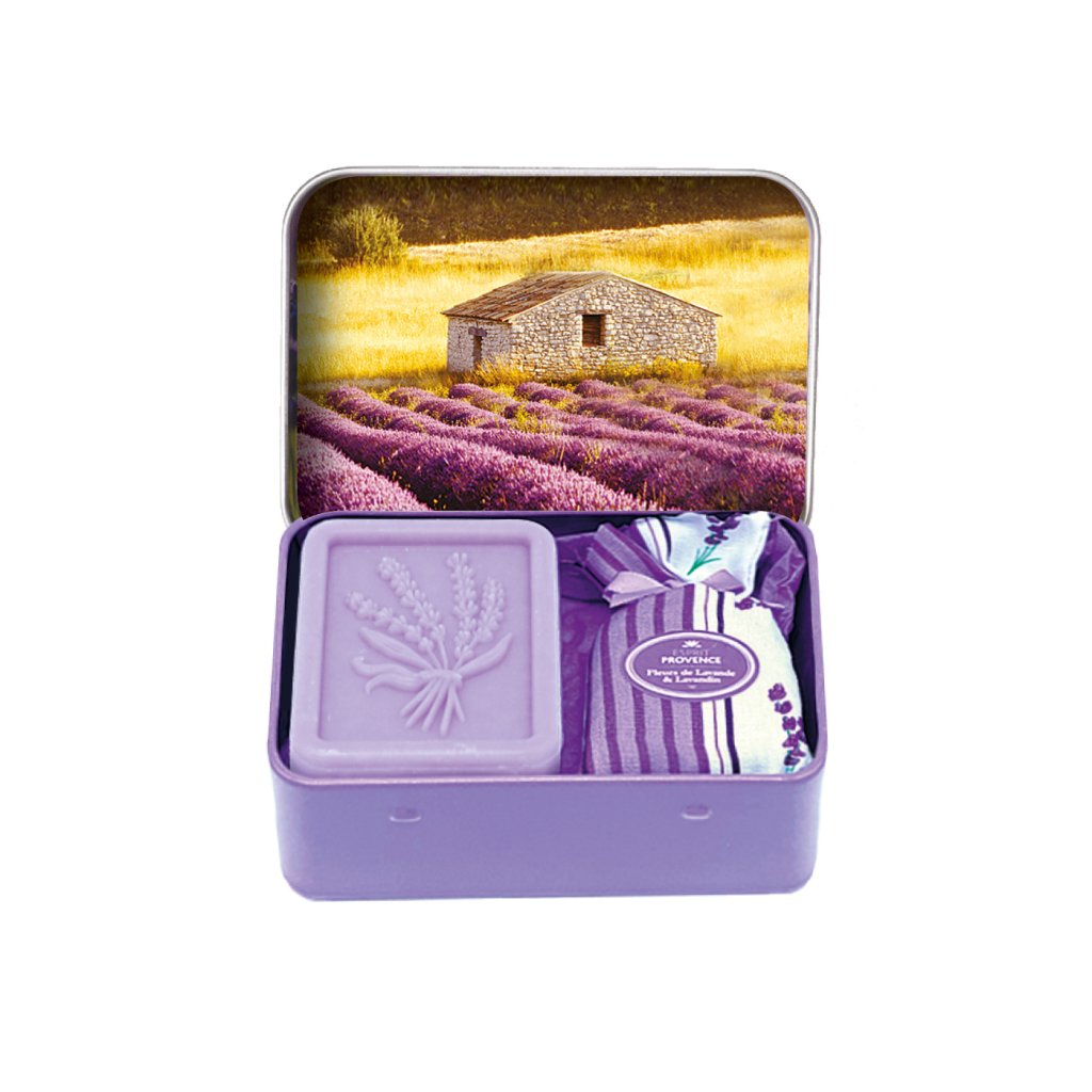 Objavte kúzlo Provence s týmto elegantným darčekovým setom od francúzskej značky Esprit Provence! Súprava obsahuje tuhé mydlo s vôňou levandule, ktoré zanecháva pokožku hebkú, prevoňanú a sviežu a levanduľové voňavé vrecúško, ktoré dodá vášmu domovu alebo šatníku príjemnú prírodnú vôňu. To všetko je ukryté v krásnej plechovej dóze s motívom levanduľového poľa, ktorá poteší ako štýlový darček alebo elegantný doplnok.