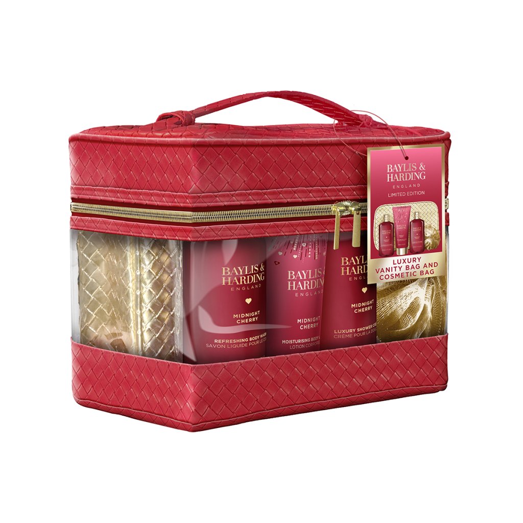 Midnight Cherry - súprava starostlivosti o telo a taštička, 5 ks sada telových produktov s čerešňovou vôňou a mini kozmetickej taštičky