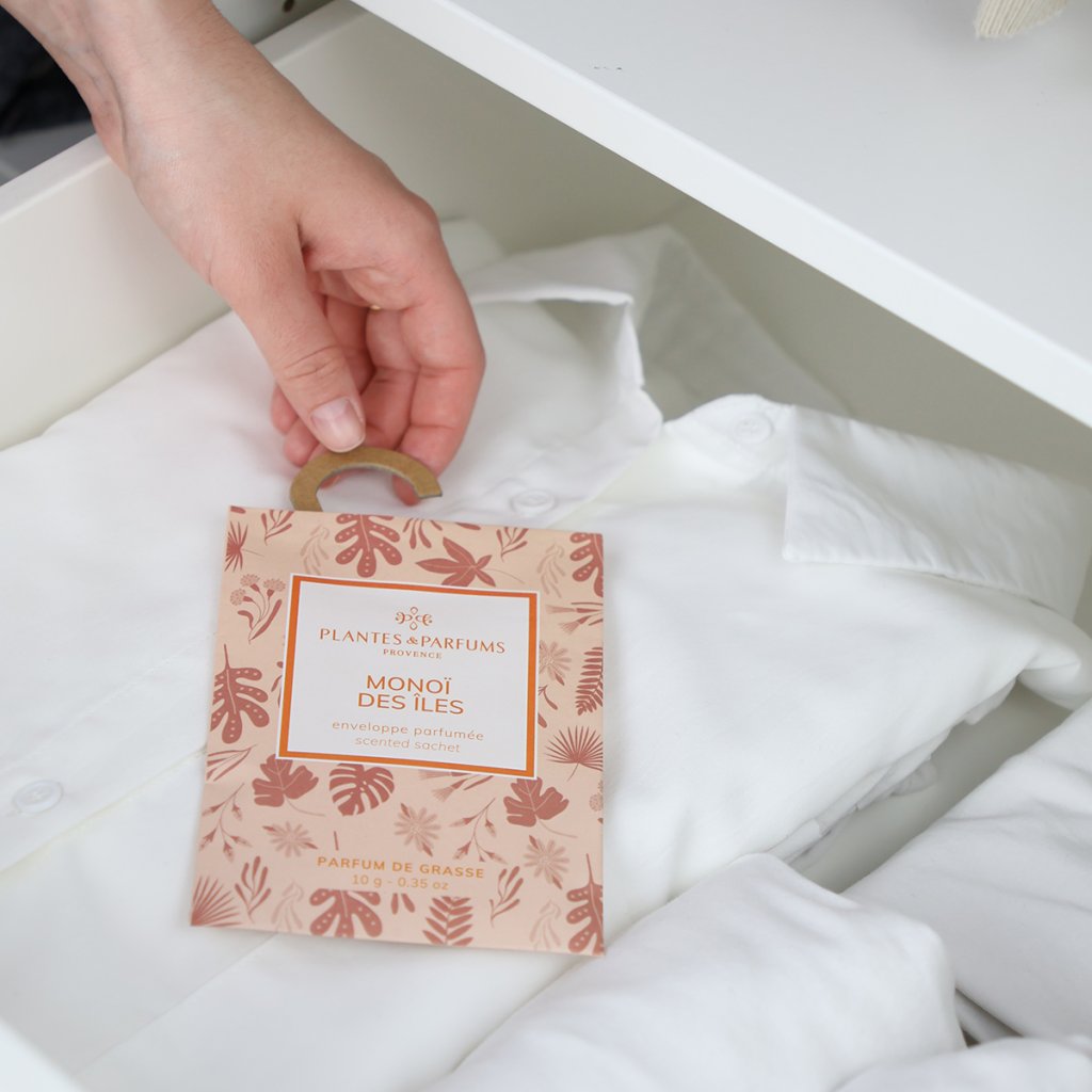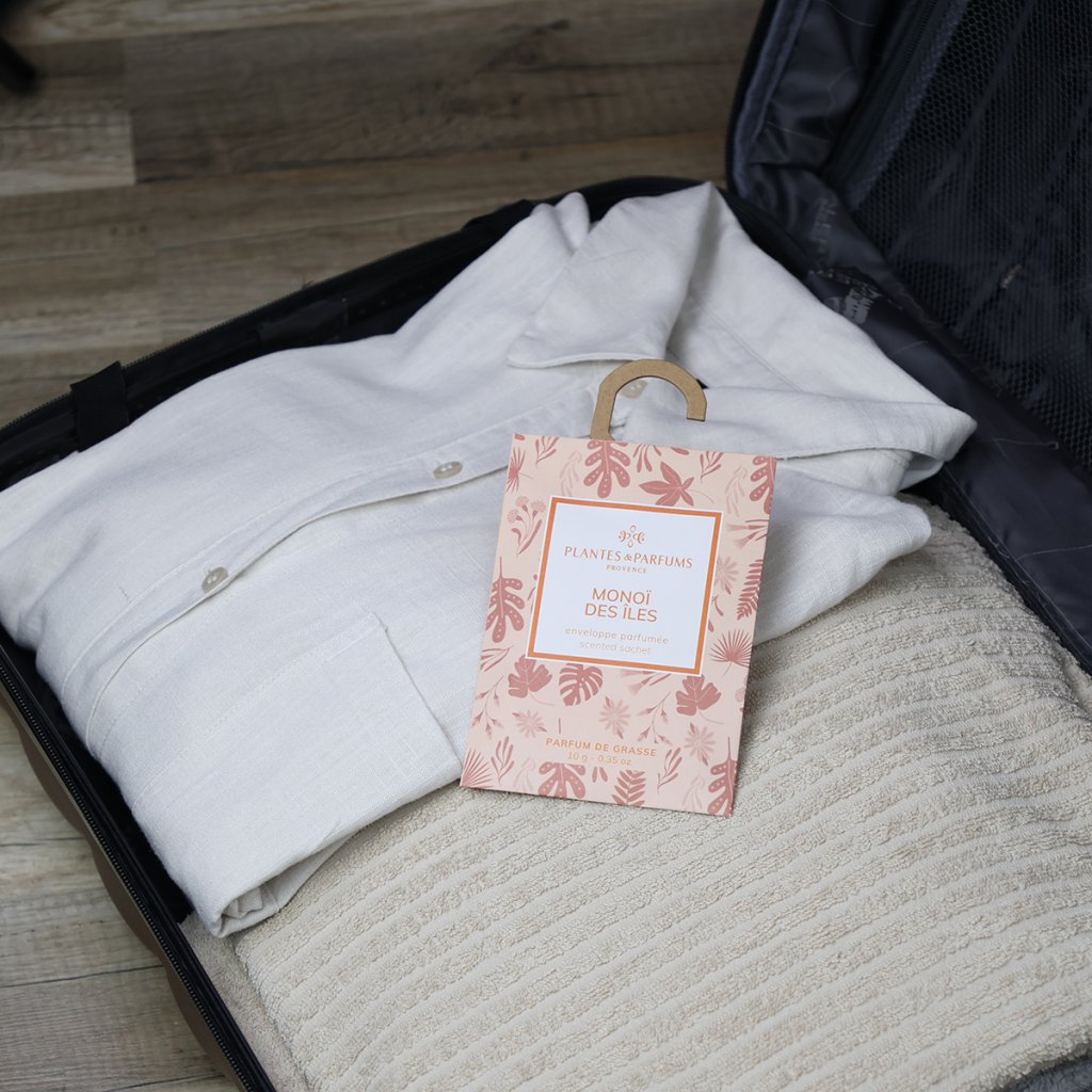 Toto praktické vonné vrecúško do skrine je vytvorené z kvalitných parfumov z Grasse a prináša rovnaký charakter vône, aký poznáte z bytových parfumov, sviečok alebo vonných difuzérov značky Plantes & Parfums de Provence. Ostrov Monoi ukrýva vôňu kokosu, bielych kvetov a monoi, doplnenú kvetinovými tónmi.
