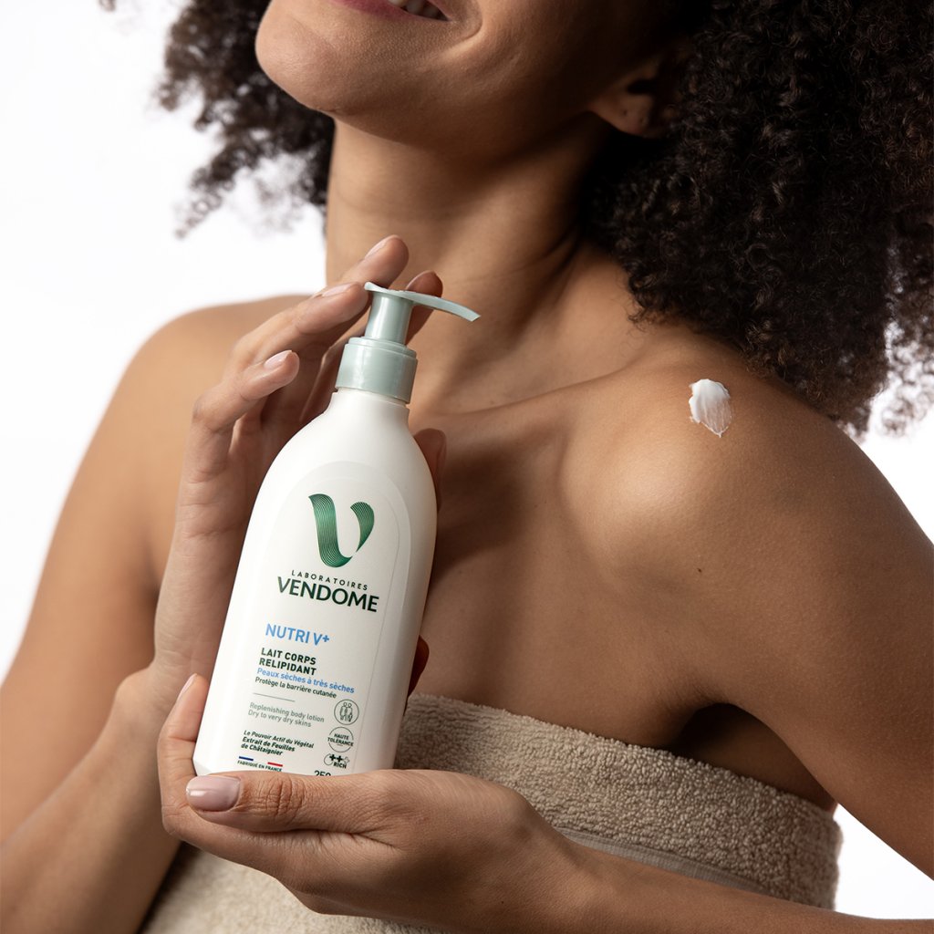 Starostlivosť, ktorá prináša úľavu aj tej najsuchejšej pokožke! Relipidačné telové mlieko Vendome NUTRI V+ bolo špeciálne vyvinuté pre suchú až veľmi suchú a citlivú pokožku celej rodiny. Šetrné zloženie intenzívne vyživuje, upokojuje a poskytuje dlhotrvajúcu 24-hodinovú hydratáciu. Zároveň posilňuje kožnú bariéru a chráni ju pred ďalším vysušovaním.
