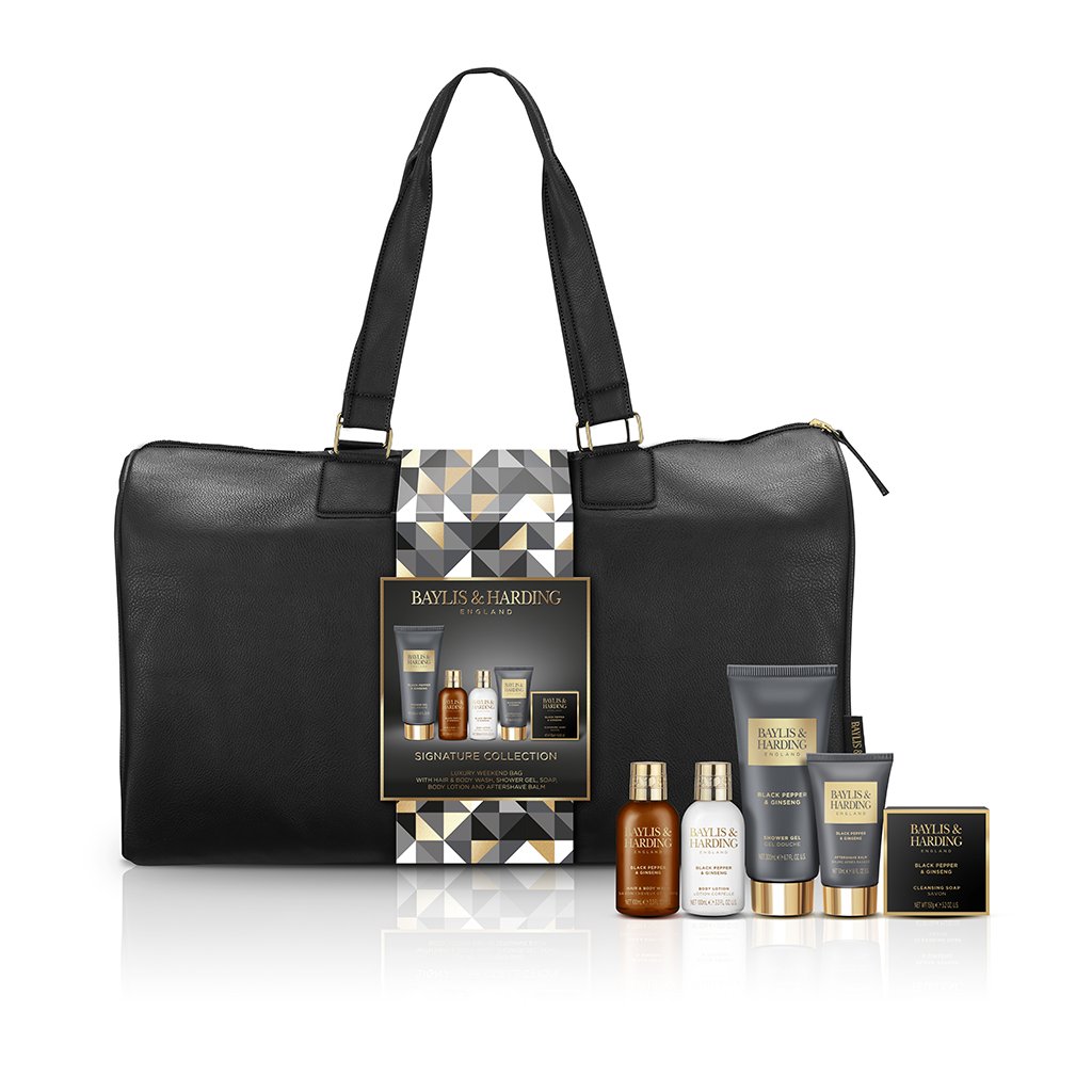 Darčeková sada v cestovnej taške obsahuje sprchový gél, mydlo, sprchový gél a šampón 2v1, telové mlieko, balzam po holení s mužnou vôňou čierneho korenia, ženšenu, bergamotu a santalového dreva.