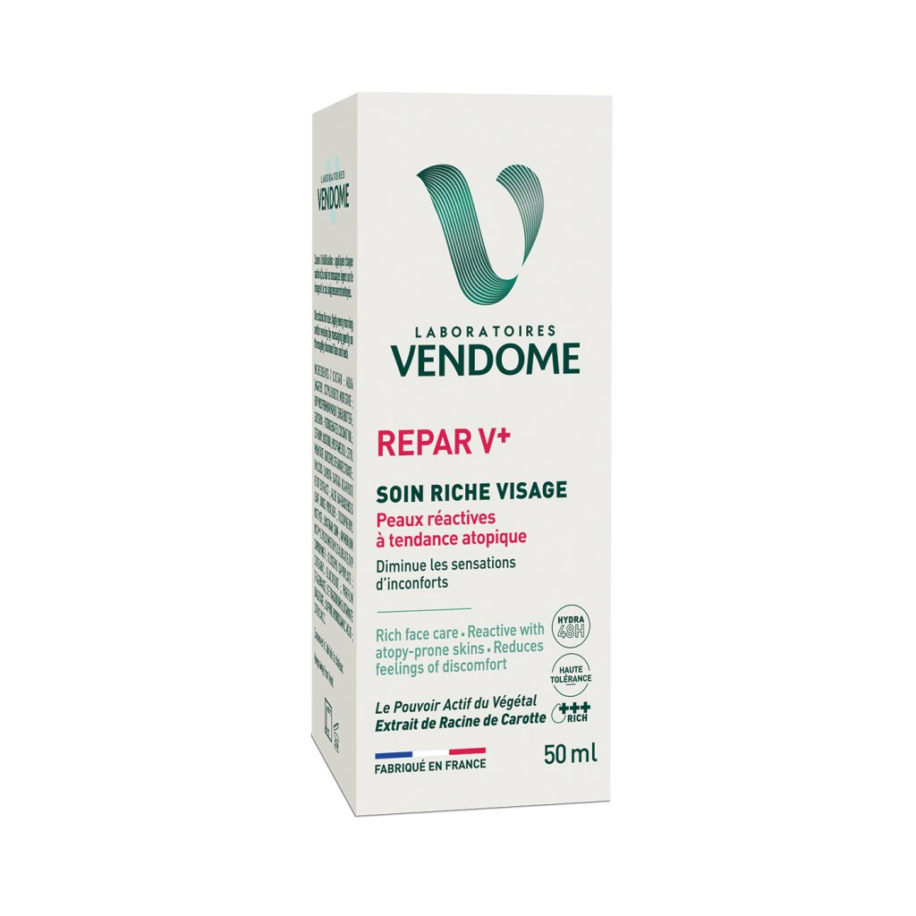 Citlivá pleť so sklonom k atopii potrebuje jemnú, ale cielenú starostlivosť, ktorá ju upokojí, obnoví jej komfort a podporí ochrannú bariéru. Hydratačný pleťový krém Vendome REPAR V+ poskytuje až 48 hodín hĺbkovej hydratácie, zmierňuje pocity napätia a začervenania a pomáha predchádzať vysušovaniu pokožky. Jeho bohatá, vyživujúca textúra sa ľahko vstrebáva a zanecháva pleť jemnú, vláčnu a upokojenú.