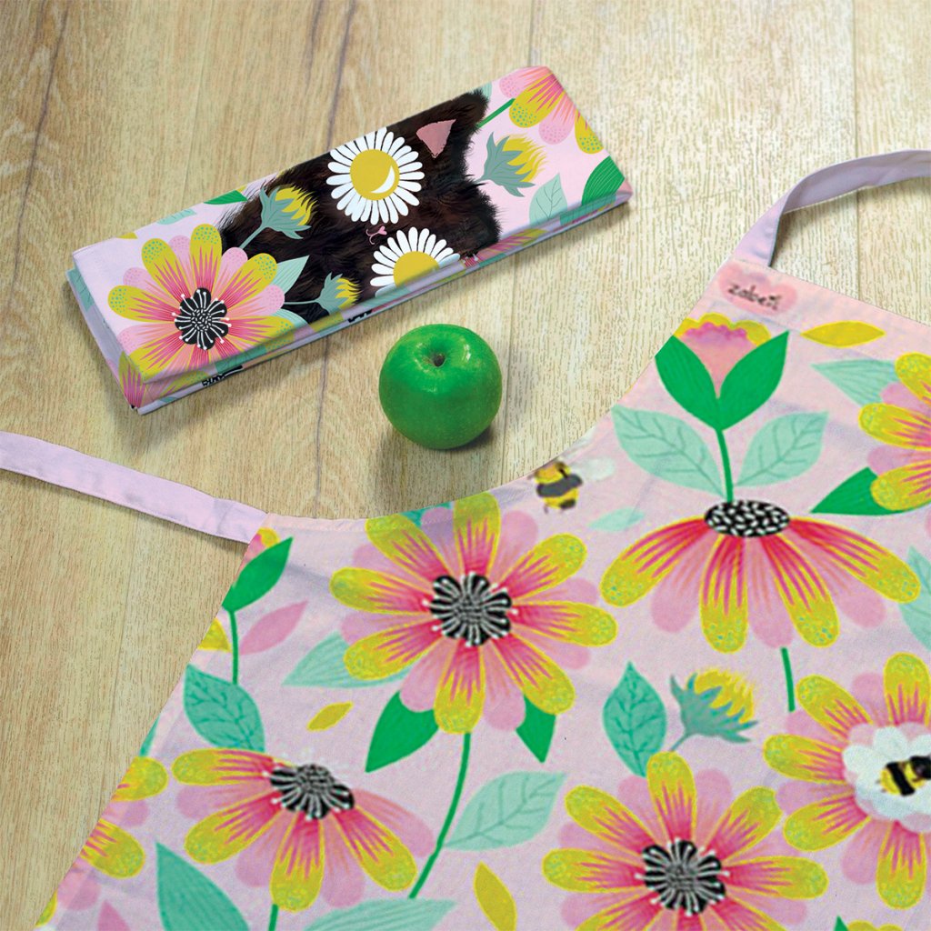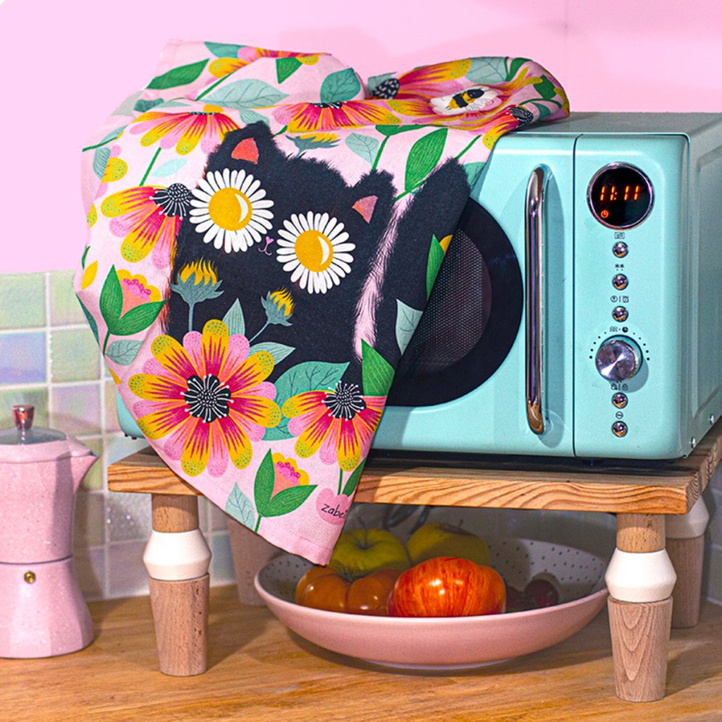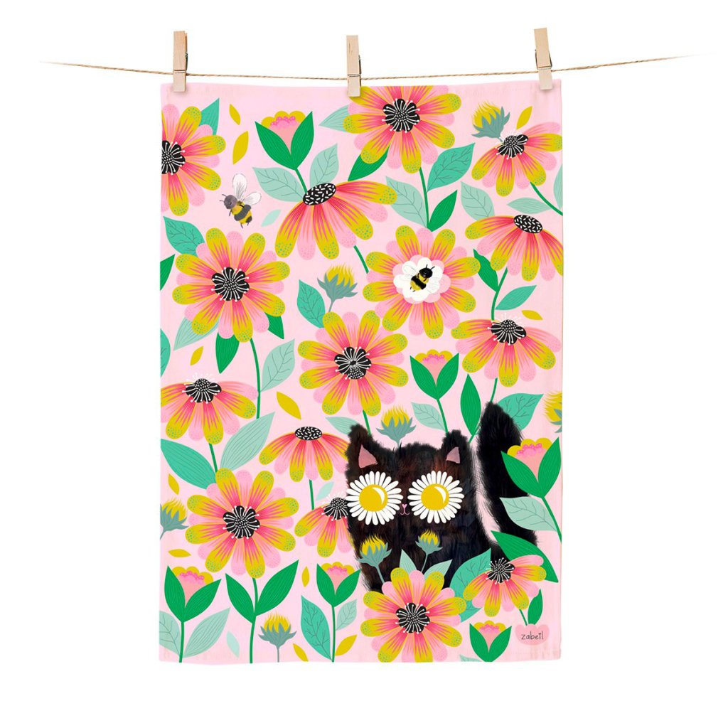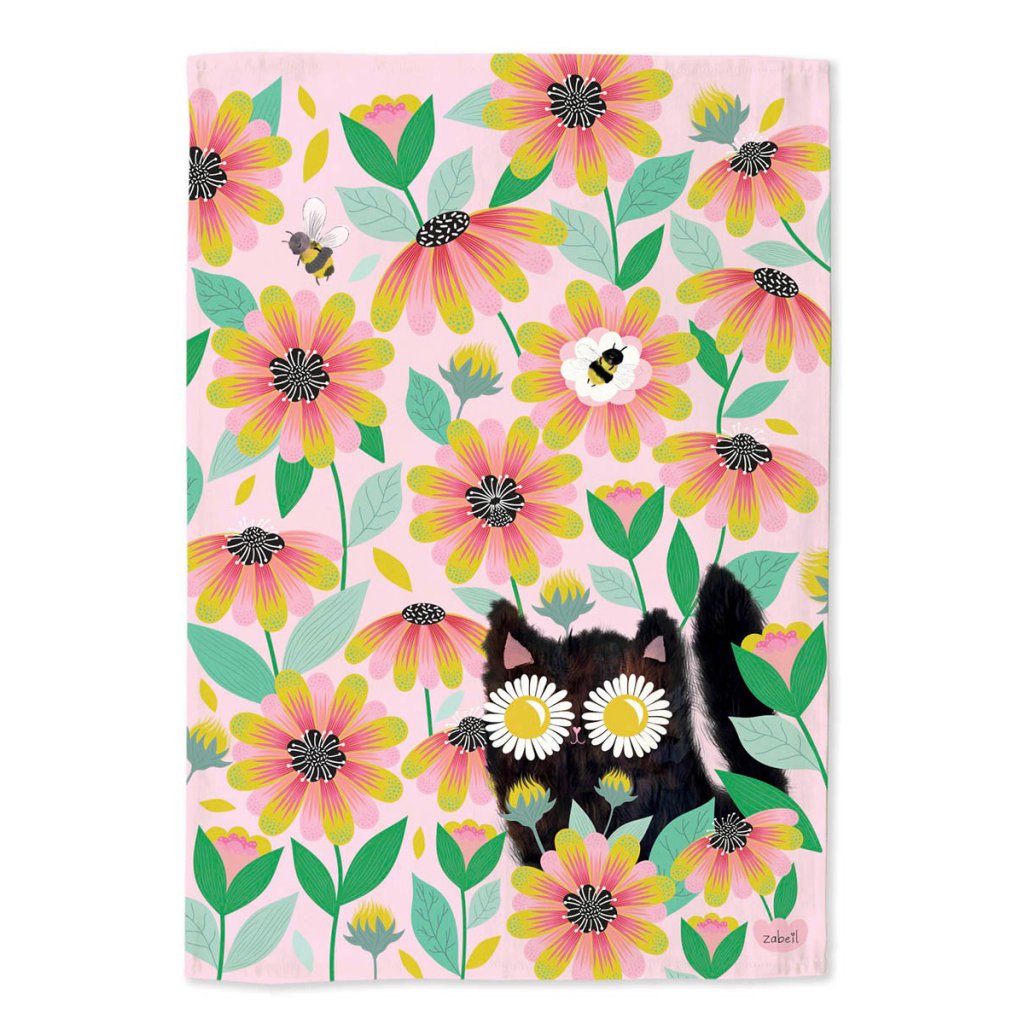 Kvety, farebné tóny a… čierna mačka s kvetinovými „okuliarmi“. Retro, ale s nadhľadom. Táto dizajnová kuchynská utierka od francúzskej ilustrátorky Zabeil spája estetiku 70. rokov s hravou energiou a jemnou dávkou humoru. Výrazný kvetinový vzor rozžiari každú kuchyňu – a nenápadný mačací detail pobaví pri každom pohľade.