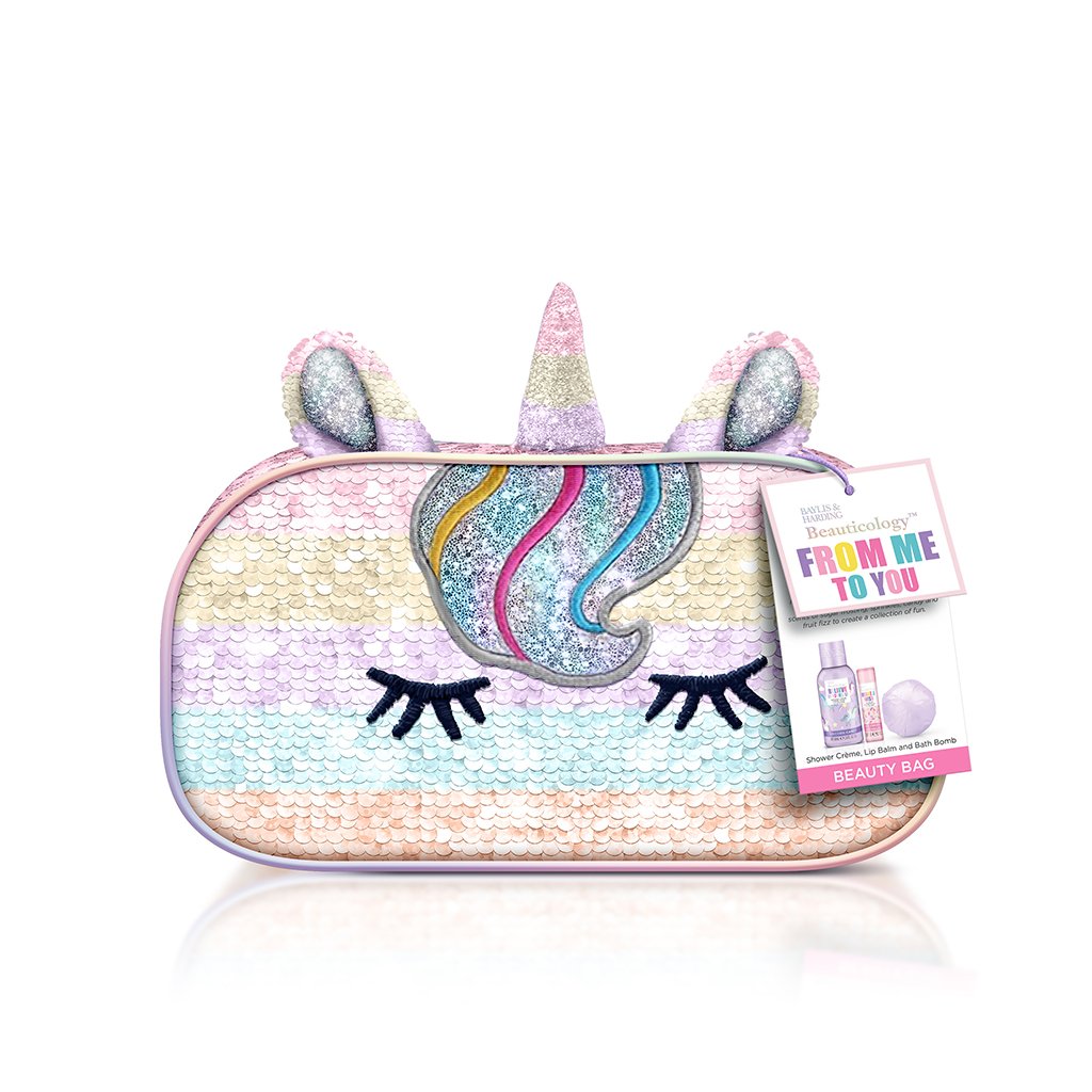 Darčeková sada obsahuje sprchový krém, šumivú bombu a balzam na pery. V puzdre v tvare jednorožca, posiatom flitrami.