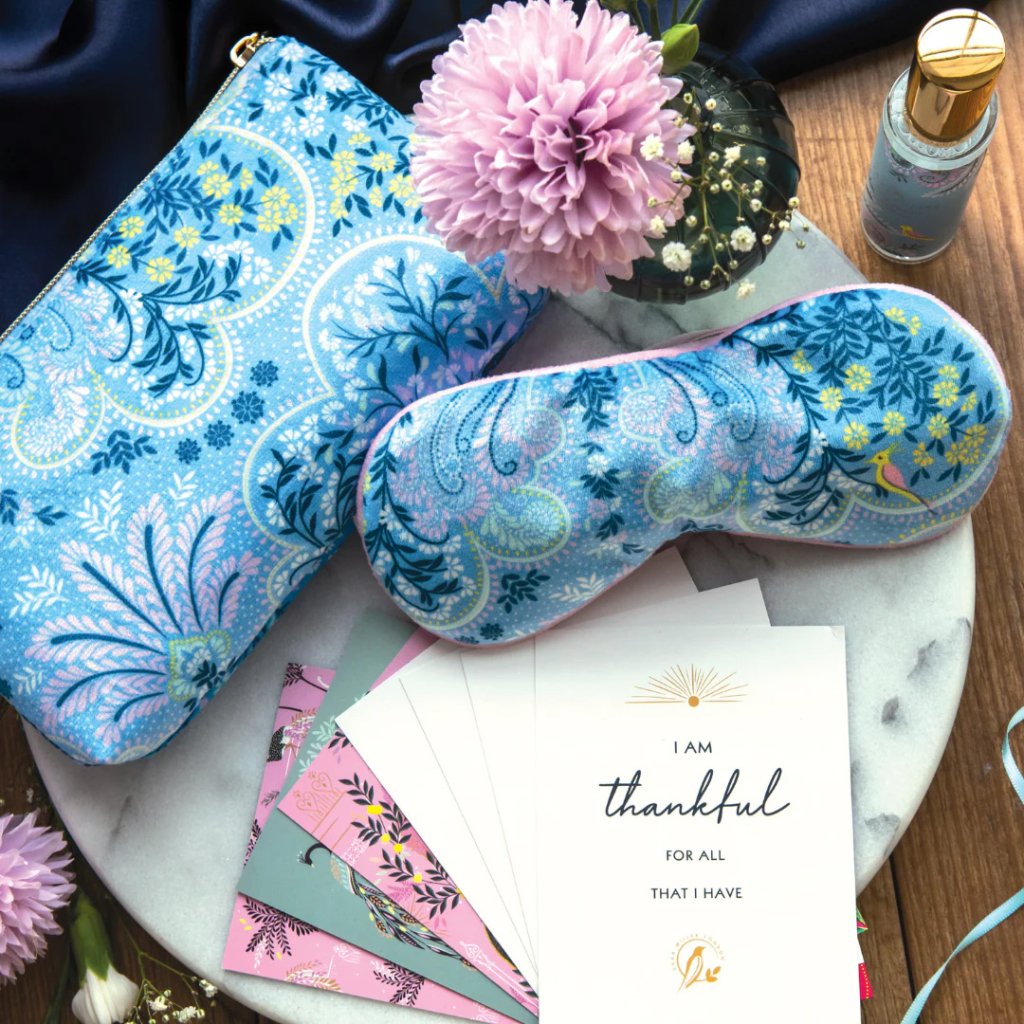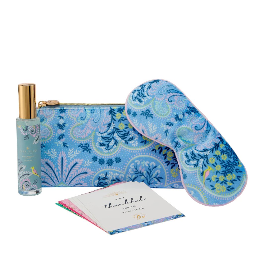 Vstúpte do čarovného sveta značky Sara Miller London s luxusnou wellness súpravou, ktorá poteší každú ženu. Zamatová kozmetická taštička v odtieni púdrovej modrej s filigránovou potlačou ukrýva doplnky pre dokonalý odpočinok – sprej na vankúš s vôňou pivonky, bergamotu a ambry, zamatová maska na oči (s levanduľovou výplňou) a sedem kariet s pozitívnymi afirmáciami pre pokojnú myseľ a hlboký spánok. Afirmácie sú navrhnuté ako malé umelecké kartičky s krásnymi motívmi značky Sara Miller.