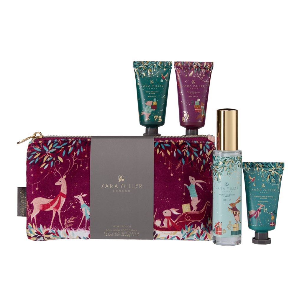 Luxusná súprava Sara Miller Woodland Tales je uložená v zamatovej taštičke so zipsom, ktorú zdobia pôvabné motívy lesných zvieratiek. Štyri ošetrujúce produkty ponúknu kompletný rituál pre jemnú, prevoňanú a hydratovanú pokožku, doplnený o upokojujúci sprej na vankúš pre relaxáciu pred spánkom.