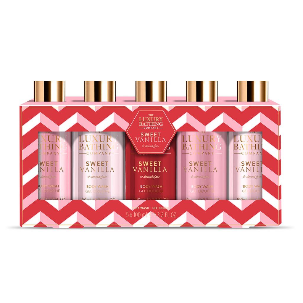 Sladká vanilka a mandľová poleva - súprava na starostlivosť o telo, 5 ks sada mini sprchových gélov s vôňou ovocia, vanilky a karamelu, 5 × 100 ml