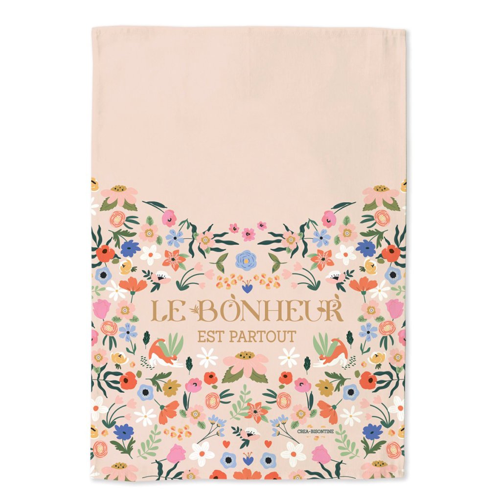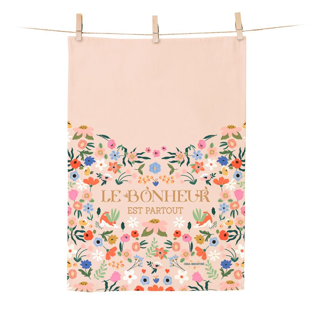 Dizajnová kuchynská utierka s kvetinovým motívom a nápisom „Le bonheur est partout“ („Šťastie je všade okolo“) vnesie do vašej kuchyne farbu aj pozitívnu náladu. Autorská ilustrácia od francúzskej tvorkyne Créy Bisontine prepája kvety a jemne ukryté zvieracie motívy v dekoratívnom dizajne.