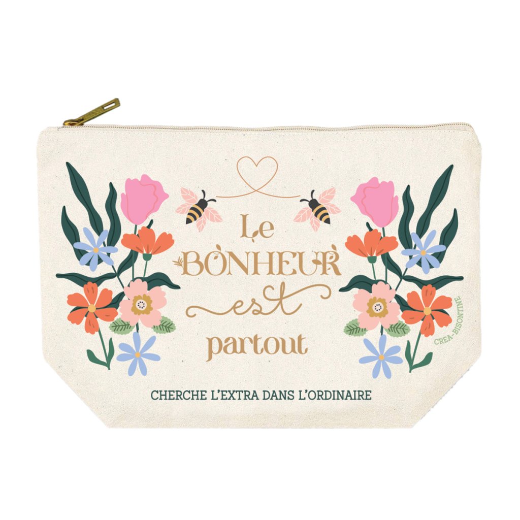 Veľká kozmetická taška z bavlny s jemným kvetinovým motívom a nápisom „Šťastie je všade“ je štýlovým doplnkom vašej kozmetiky aj každodenných rituálov.