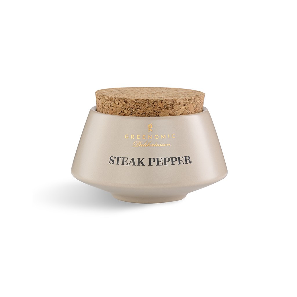 Steak, ktorý si zaslúži reštauračnú kvalitu – presne k tomu smeruje zmes korenia Greenomic Steak Pepper. Aromatická kombinácia čierneho korenia, soli, cesnaku, tymiánu, cibule, papriky a paradajok zvýrazní chuť hovädzieho steaku, burgeru, bravčových kotliet aj grilovanej zeleniny. Korenie je uložené v ručne vyrobenej hlinenej dóze, inšpirovanej tradičnou japonskou keramikou.
