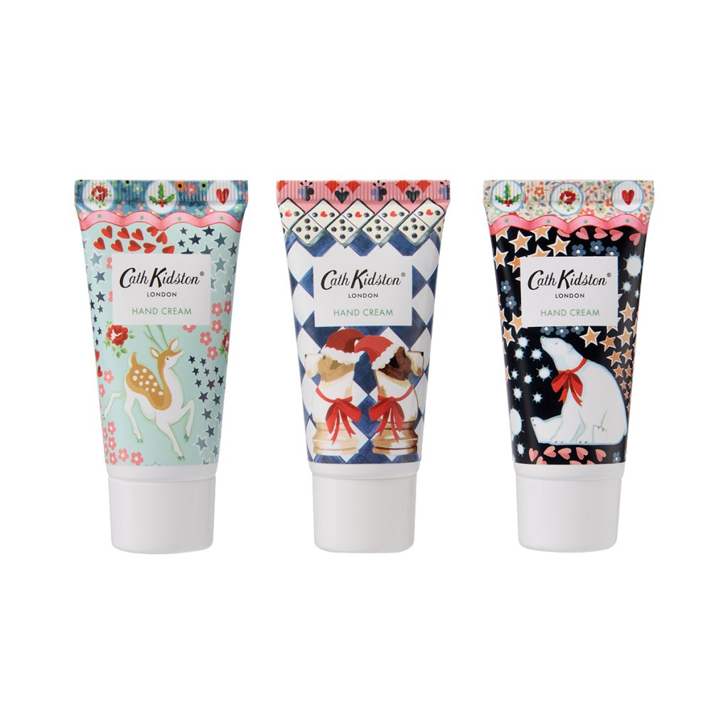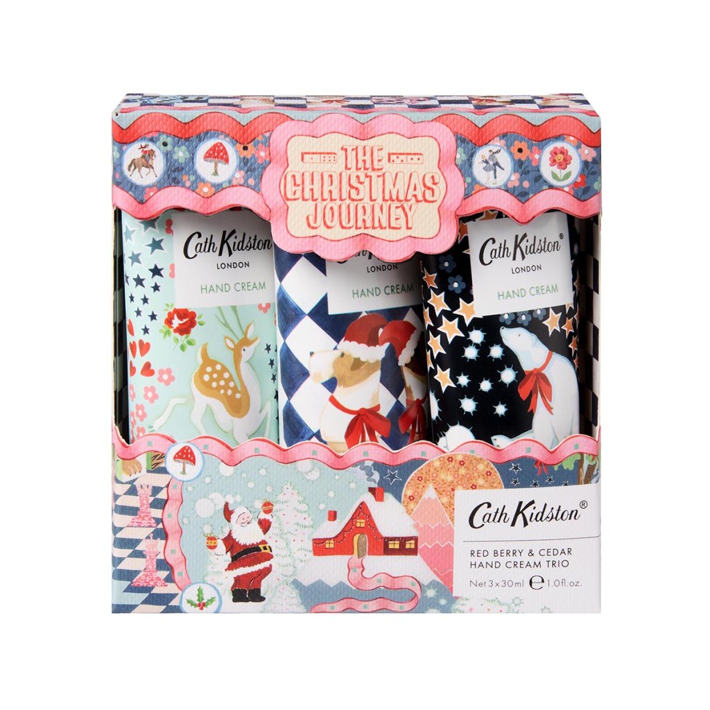 Darčeková sada Cath Kidston The Christmas Journey prináša trio krémov na ruky s vôňou červených bobúľ a cédrového dreva, obohatené o esenciálne oleje z borievky a jedle. Sviatočné obaly zdobia miniatúra Santu, roztomilé psíky v čiapkach, ľadové medvede a soby. Skvelý tip na drobný vianočný darček, ktorý vykúzli úsmev a poteší pri každom použití.