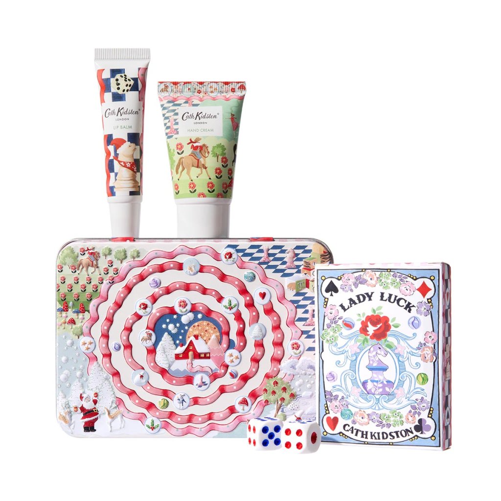Otvorte veko a nechajte sa preniesť do čarovného vianočného sveta Cath Kidston, kde sa mieša hrejivá atmosféra sviatočných večerov s radosťou zo spoločných hier. Vnútri na vás čaká krém na ruky s bohatým bambuckým maslom a vitamínom E, ktorý premení suchú pokožku na hodvábne jemnú a prevonia ju zmesou červených bobúľ, cédrového dreva, ihličia a sladkého kandizovaného cukru. Vyživujúci balzam na pery s krémovou vôňou vaječného koňaku dodá perám starostlivosť aj jemný lesk.