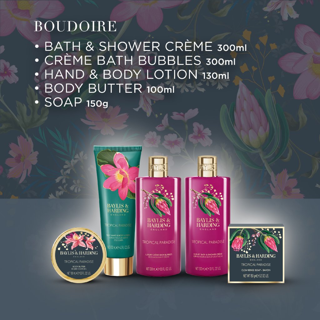 Trendy kolekcia Boudoire - Tropical Paradise prináša exotický kvetinový dizajn s moderným nádychom a štipkou luxusu. Odvážna paleta fuchsiovo ružovej a smaragdovo zelenej je doplnená zlatými detailmi, ktoré celej rade dodávajú výnimočný charakter. Ošetrujúce produkty a nádherné darčekové sady sprevádza tropická vôňa banánu, broskyne a pomarančového kvetu.