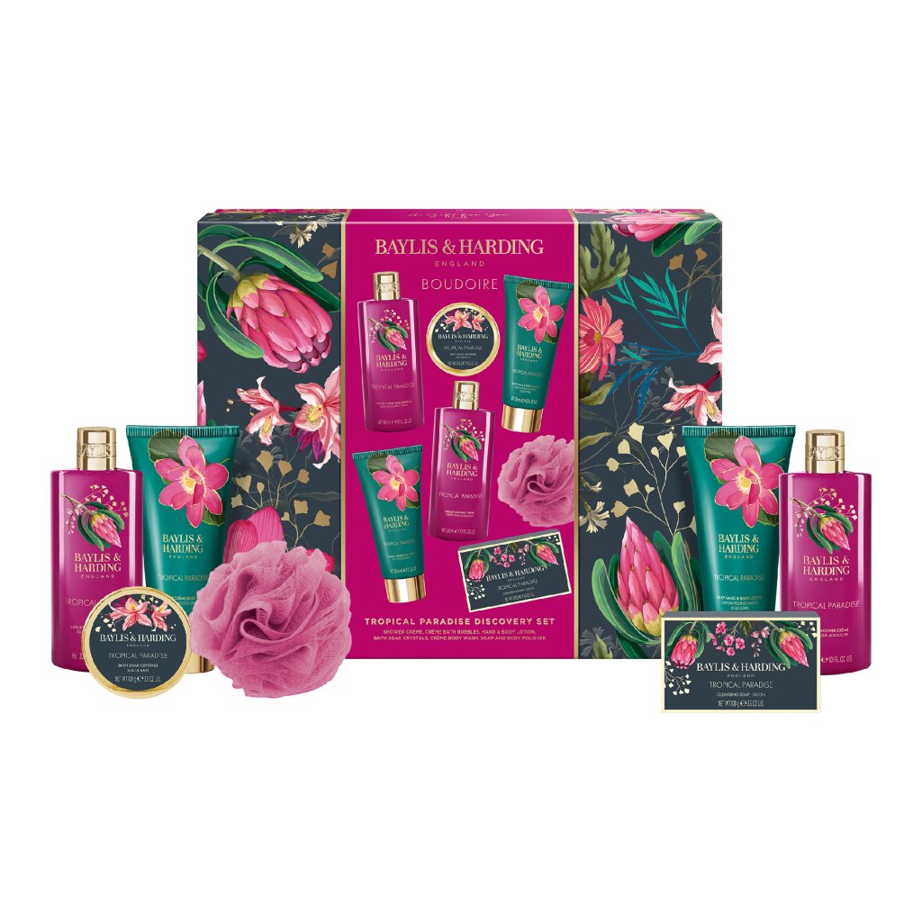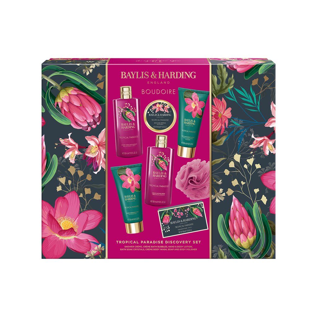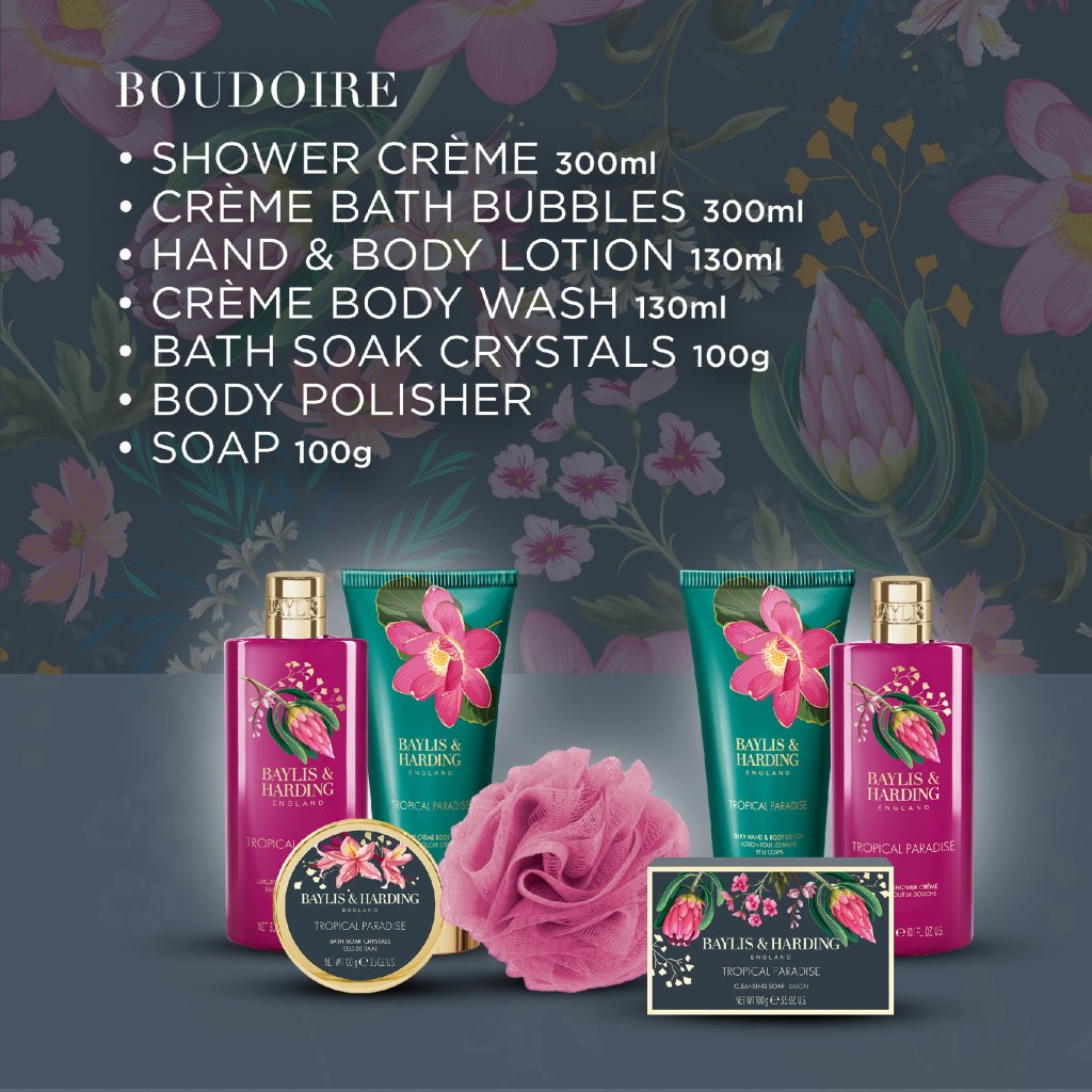 Trendy kolekcia Boudoire - Tropical Paradise prináša exotický kvetinový dizajn s moderným nádychom a štipkou luxusu. Odvážna paleta fuchsiovo ružovej a smaragdovo zelenej je doplnená zlatými detailmi, ktoré celej rade dodávajú výnimočný charakter. Ošetrujúce produkty a nádherné darčekové sady sprevádza tropická vôňa banánu, broskyne a pomarančového kvetu.