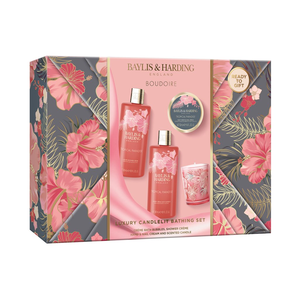 Tropical Paradise - súprava s starostlivosťou o telo a sviečkou, 4 ks veľká darčeková relaxačná sada v elegantnom balení s tropickým kvetinovým motívom