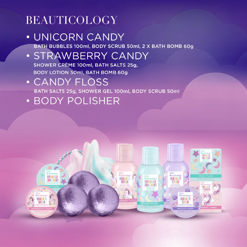 Kolekcia Beauticology je hravá, zábavná, čarovná a farebná. Dizajn s holografickými detailmi, veselými farbami a galaktickými motívmi tvorí spoločne s rozmanitými vôňami cukroviniek perfektnú kolekciu pre malé či väčšie milovníkov jednorožcov!