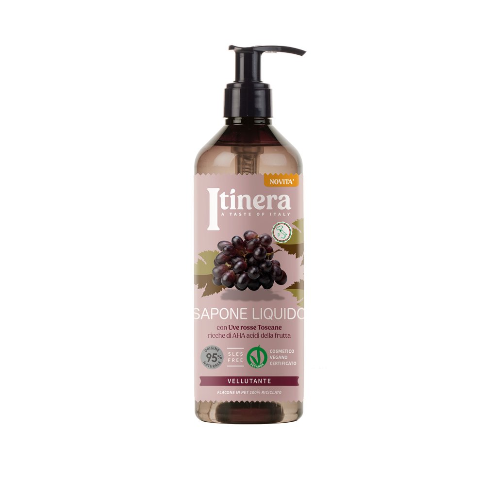 Doprajte pokožke rúk luxusnú starostlivosť s Itinera tekutým mydlom, obohateným o extrakt z toskánskych červených hrozna s obsahom AHA kyselín, ktoré jemne čistia a zároveň vyhladzujú pokožku. Vďaka zloženiu s 95 % prírodných zložiek, vrátane extraktu z aloe vera a glycerínu, mydlo nielen dokonale čistí, ale tiež hydratuje, upokojuje a chráni pokožku pred vysúšaním. Tóny korenia, mošusu, ovocia a vanilky premenia každé umývanie rúk na príjemný zmyslový zážitok.