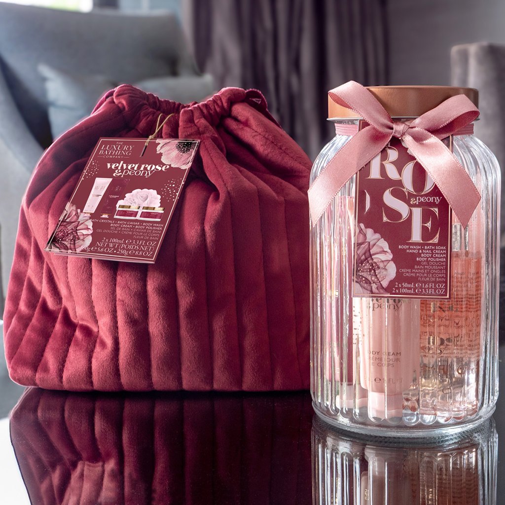 Velvet Rose & Peony - súprava na starostlivosť o telo a ruky, 5 ks darčeková sada telových produktov s kvetinovou vôňou, v luxusnej sklenenej dóze