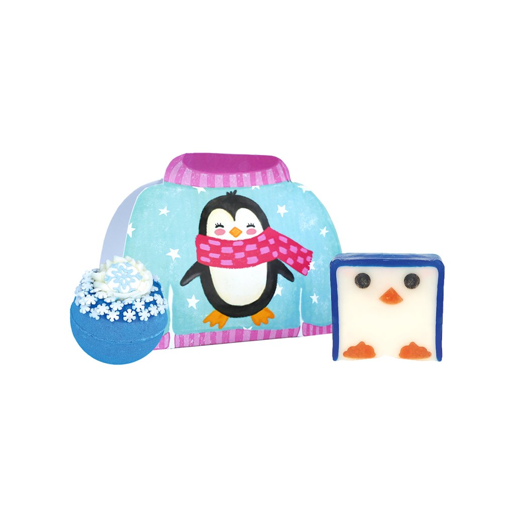 Pripravte sa na poriadnu ľadovú zábavu! Táto rozkošná darčeková súprava poteší nielen deti, ale aj hravé duše dospelých. Vo vnútri nájdete šumivú bombu do kúpeľa a mydlo s tučniakom, oba produkty plné prírodných esenciálnych olejov, ktoré prevoňajú pokožku sviežou zimnou vôňou a zanechajú ju hebkú a jemnú.